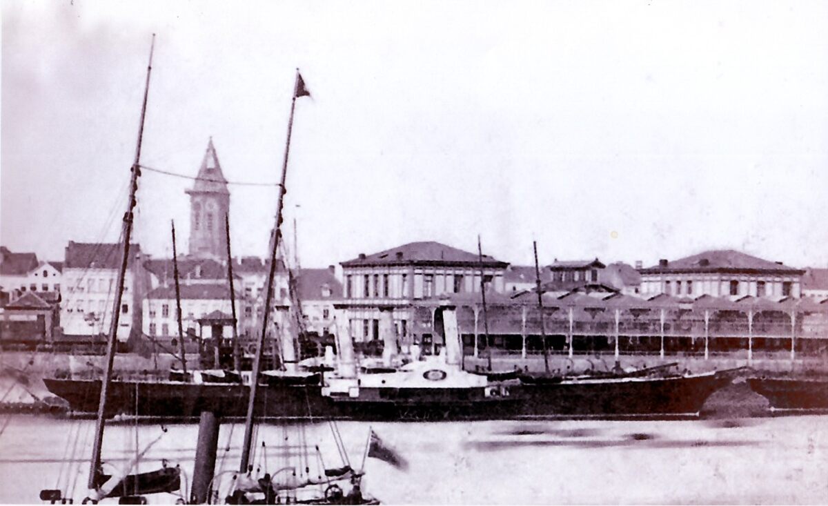 Afdruk A4. - Raderstoomboot "Prince Baudouin" (1872-1897) gemeerd nabij het eerste Zeestation. Op de achtergrond, de toren van de Sint-Pieterskerk, bijgenaamd "De Peperbusse".