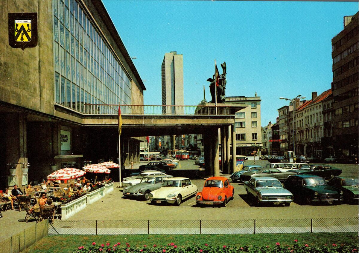J.V.D.B., n° 102/3. - De noordgevel van de vierde Kursaal langs de Van Iseghemlaan. Op de luifel van de hoofdingang, de sculptuur "De Vier Elementen" van beeldhouwer Oscar Jespers. Op de hoek van de Van Iseghemlaan en de Langestraat het "Hôtel Bel-Air". In het midden, de woontoren "Europacentrum".