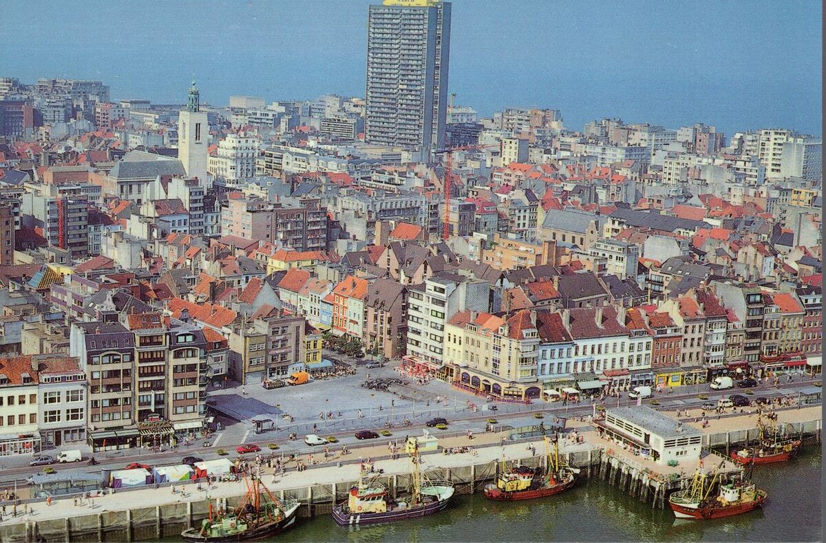 Tropic T 301. - Luchtfoto van het Visserskwartier. Vooraan, vissersvaartuigen gemeerd in het Montgomerydok langs de Visserskaai. De Garnaalmijn, nadien het Noordzeeaquarium. Nu, 2020, gesloten. De Visserskaai, met in het midden, het Vissersplein. Links, de toren van het Feest- en Kultuurpaleis en op de achtergrond, de woontoren "Europacentrum" langs de Van Iseghemlaan.