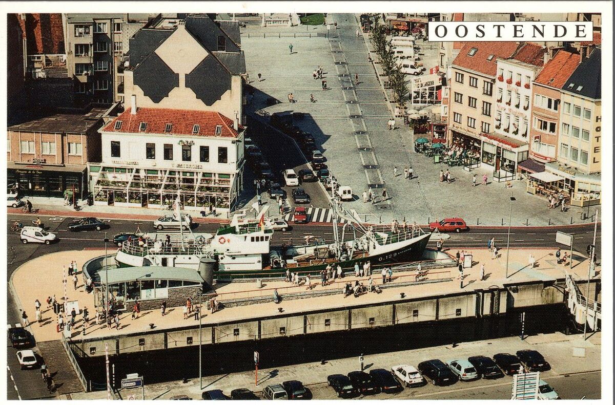 Tropic T 309. - Panorama. Vooraan, de "Mercator" zeesluis, die toegang geeft van het Montgomerydok tot de Mercator jachthaven. De laatste Ijslandvaarder O.129 "Amandine" , nu museum. Op de hoek van de Vindictivelaan en het Sint Petrus en Paulusplein, de brasserie "'t Waterhuis".