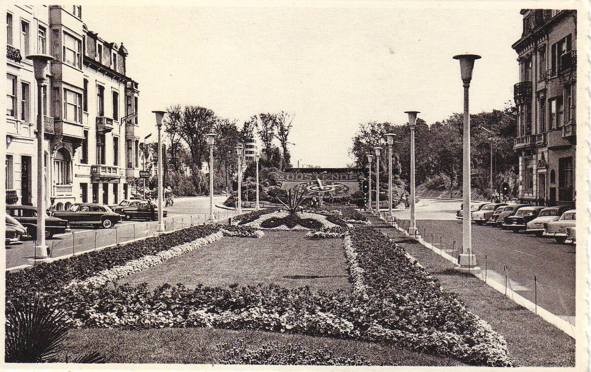 Nels. - De Leopold II-laan, gezien richting het bloemenuurwerk en het Leopoldpark. Let op de altijd verzorgde bloemenperken.