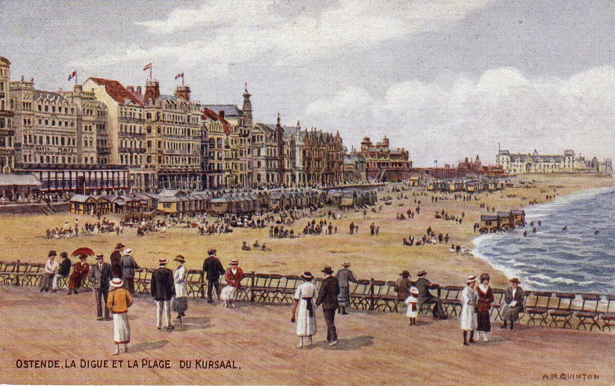 Postkaart Salmon 2461 - Ostende - La digue et la plage. - De Zeedijk, gezien vanaf "Petit Nice", richting het Koninklijk Chalet. Strandrecreatie op het Groot Strand en links, de grote hotels. Op het einde het "Royal Palace Hotel".