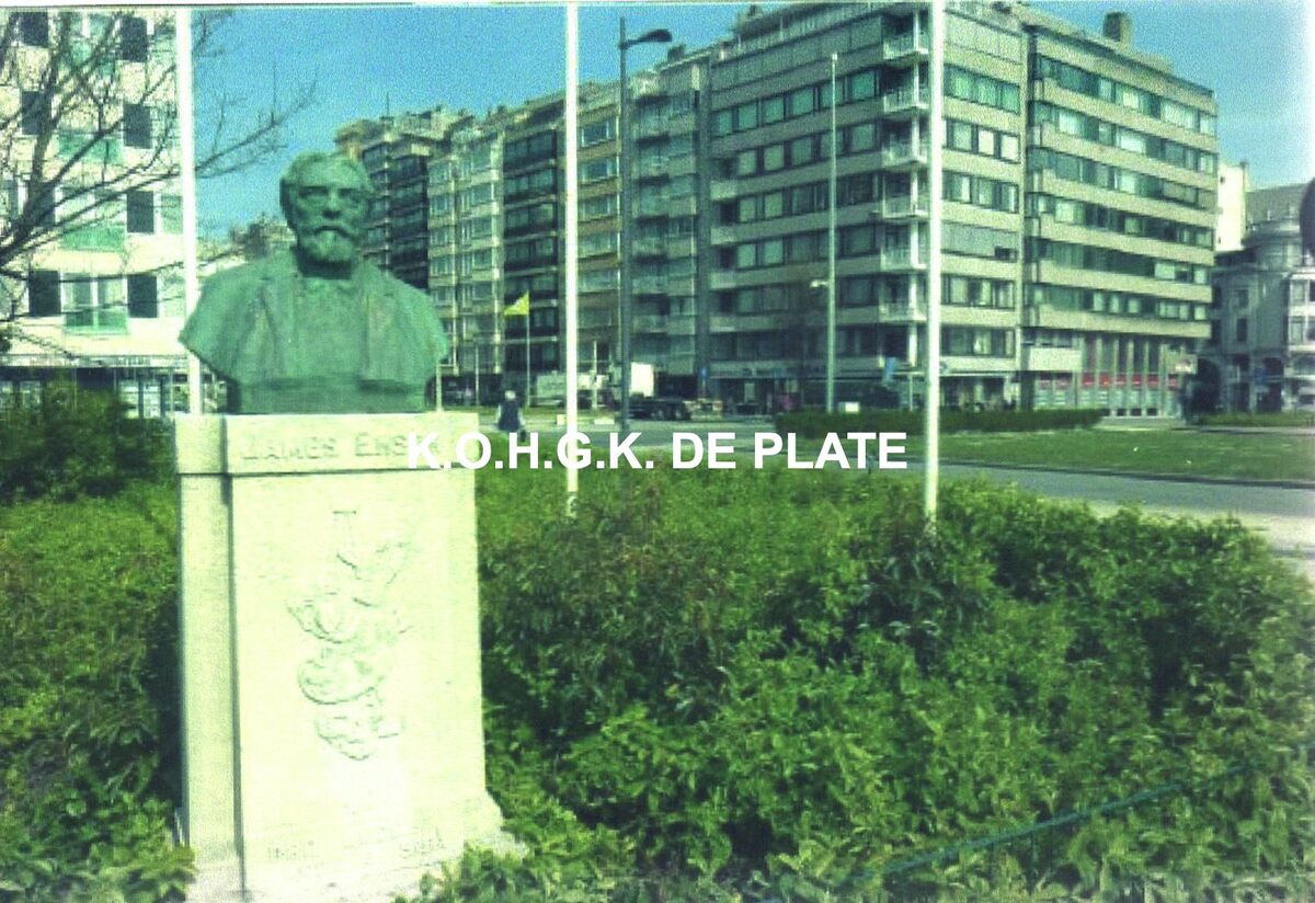 Formaat : 14 x 9.5 cm. - Het borstbeeld van James Ensor, een replica in brons van beeldhouwer Irenée Duriez. Het staat nabij de hoek van de Leopold II-laan (rechts) en de Karels Janssenslaan