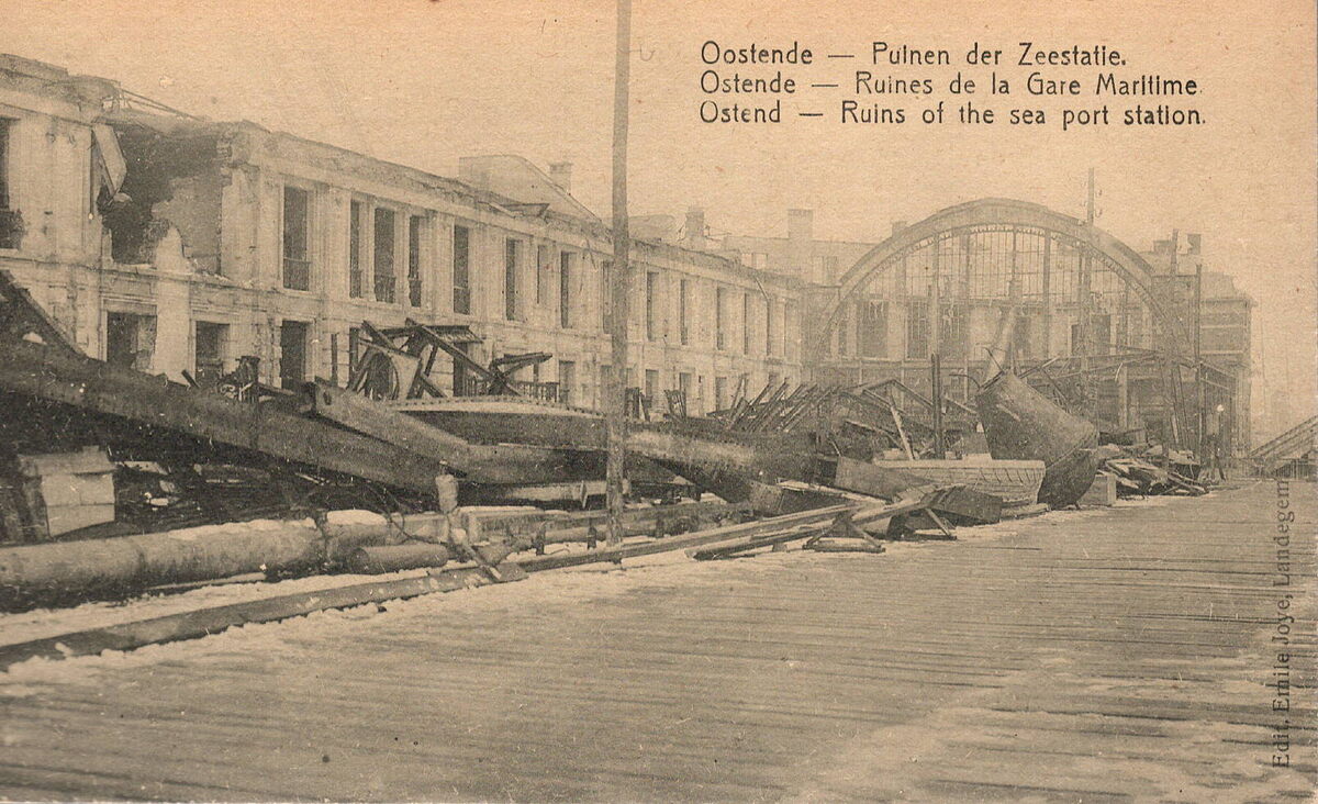 Edit. Emile Joye, Landegem. - Oostende - Puinen der Zeestatie. - Ostende - Ruines de la Gare Maritime. - Ostende - Ruins of the sea port station. - Het station leed grote schade. Hier zien we de vernielingen aan de voormalige in- en ontschepingshal. Na het slopen van de metalen resten werd deze vervangen door een eenvoudige constructie