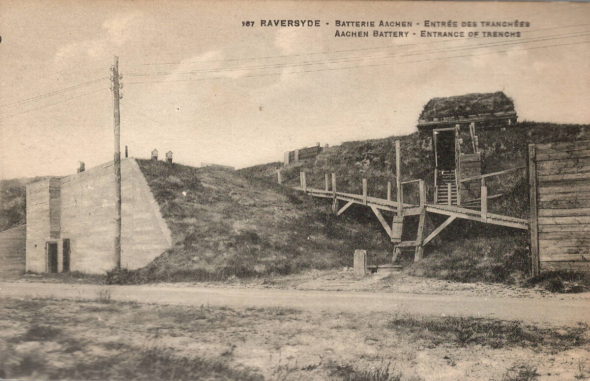 Nelson, nr. 167. Comptoir Artistique, 108, rue Victor Rauter, Bruxelles. - Raversyde - Batterie Aachen - Entrée des Tranchées. Aachen Battery - Entrance of trenches. - De batterij was gelegen in de duinenstrook van het Koninklijk Domein. Om de batterij in te planten stond het Noorse chalet van Koning Leopold II in de weg en de Duitse troepen brandden het in december 1914 plat.