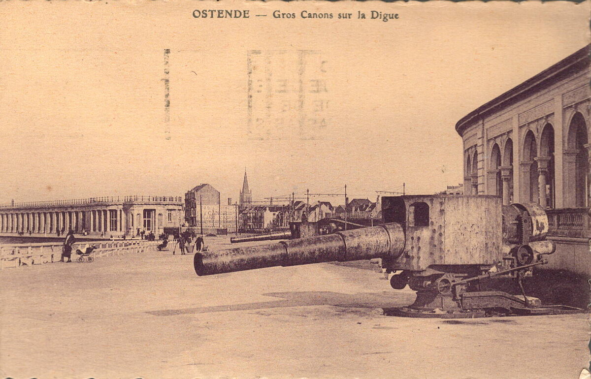 TOB, série X, N° 26. - Ostende - Gros Canons sur la Digue. - De Zeedijk. Rechts, zien we dat de gaanderijen van het Royal Palace Hotel, door de Duitsers gesloopt, reeds zijn herbouwd. Links, de Koninklijke Gaanderijen. Foto genomen na de oorlog.