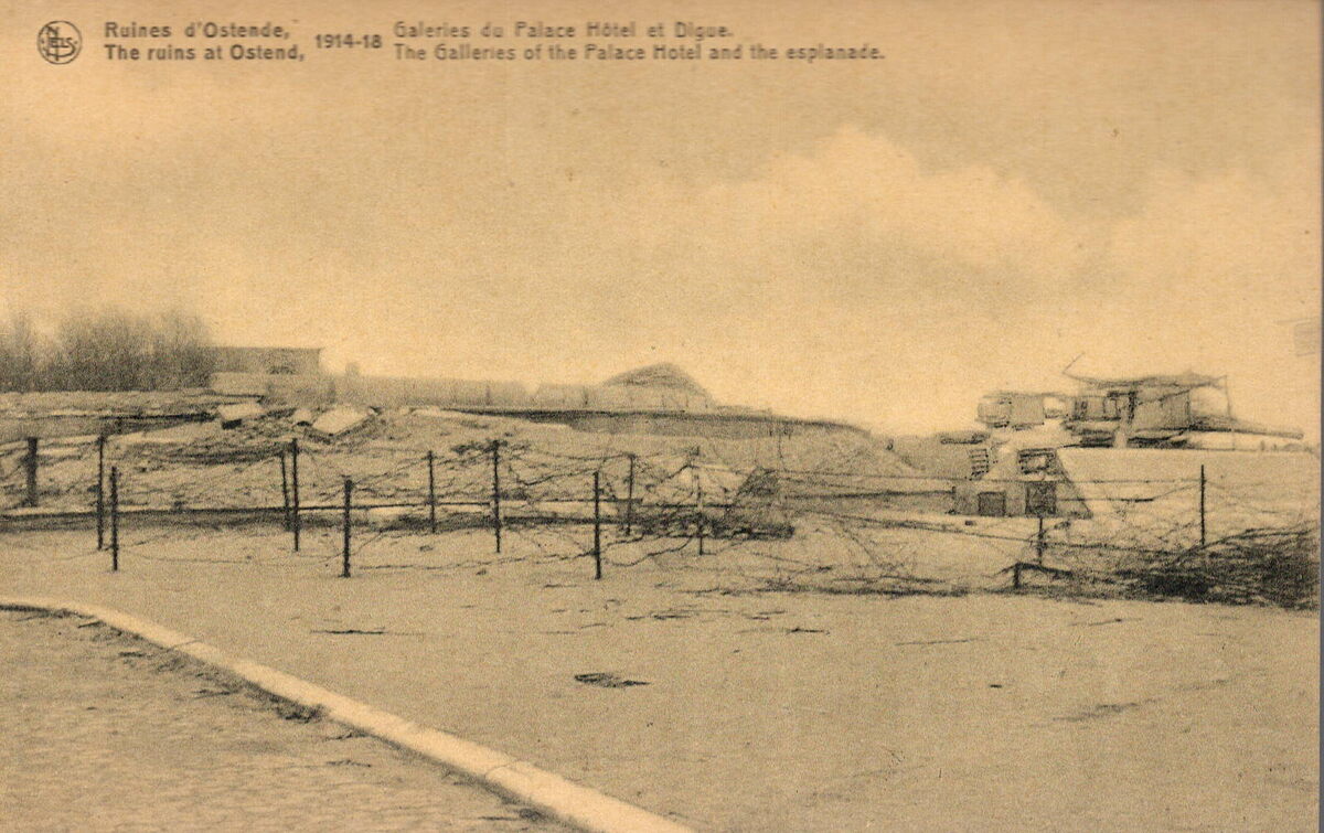 Nels. Edition J. Revyn, 14, rue du Canada, Bruxelles. - Ruines d'Ostende 1914-18 Galeries du Hôtel et Digue. - The ruins at Ostend 1914-18 The Galleries of the Palace Hotel and the esplanade. - Gedeelte van de batterij Gneisenau en wat overbleef van de gaanderijen van het Royal Palace Hotel. De gaanderijen werden door de Duitsers gesloopt. Foto genomen na de oorlog.
