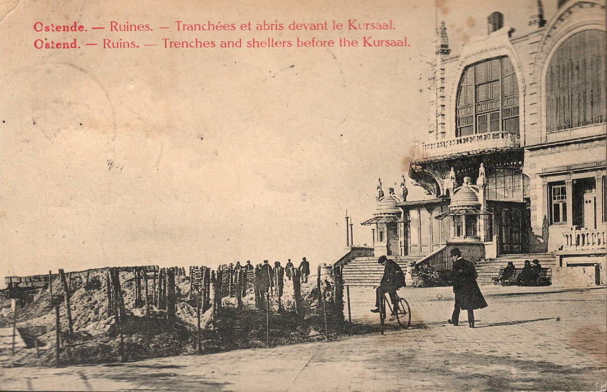 Phob. - Ostende - Ruines - Tranchée et abris devant le Kursaal. Ostend - Ruins - Trenches and shelters before the Kursaal. - Loopgraven voor het Kursaal langs de Zeedijk. Foto genomen na de oorlog. Tijdens de oorlog hing er hier aan de ingang van de westgevel een bord met "Strandheim des Marinekorps für Offiziere und Mannschaffen".