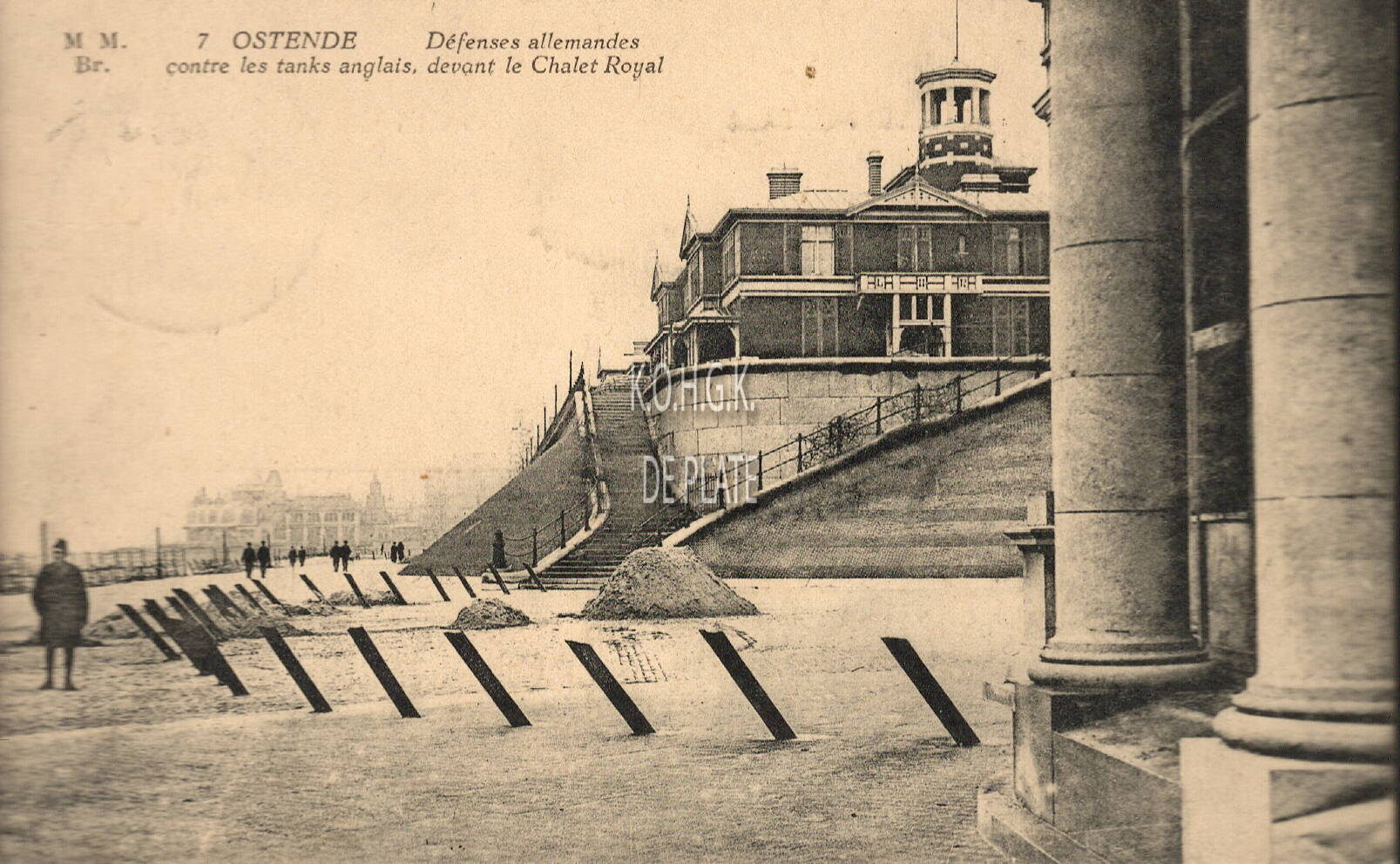 M.M.Br., n°7. Edition M.Marcovici, Brux. - Ostende - Défenses allemandes contre les tanks anglais devant le Chalet Royal. - Versperring voor de ingang van de "Drie Gapers" nabij het Koninklijk Chalet langs de Zeedijk. Foto genomen na de oorlog.