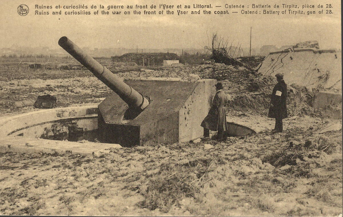 Nels. Edition A. Tempère, 26a, rue de la Chapelle, Ostende. - Ruines et curiosités de la guerre au front de l'Yser et au Littoral. Ostende - Batterie de Tirpitz, pièce de 28. Ruins and curiosities of the war on the front of the Yser and the coast. Ostend - Battery of Tirpitz, gun of 28. - De batterij was gelegen langs de Elisabethlaan.