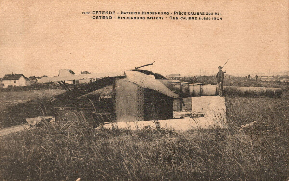 Nelson, N° 1737. Comptoir artistique 108 rue Victor Rauter Bruxelles. - Ostende - Batterie Hindenburg. Pièce calibre 320 mil. Ostend - Hindenburg battery. Gun calibre 11.889 inch. - Foto genomen na de oorlog. In oktober 1918 vernielden de Duitsers hun kanonnen. We zien links, de woningen van de oude vuurtorenwijk die het meest noorderlijk gelegen waren en dichtbij de batterij. Tijdens beschietingen vanuit zee vielen ook burgerlijke oorlogsslachtoffers.