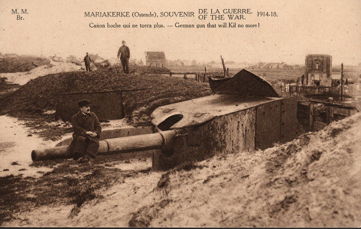 M.M.Br., Marco Marcovici, Bruxelles. - Mariakerke (Ostende) - Souvenir de la guerre = of the war 1914-18. Canon boche qui ne tuera plus. German gun tha will Kil no more !. - De batterij Cecilie lag ten oosten van de batterij Beseler en werd genoemd naar de echtgenote van de Pruisische kroonprins. De batterij kwam vlakbij de plaats waar voordien het Museum Stracké stond, dat door de Duitser werd afgebroken. De kanonnen waren opgesteld in halfronde betonbeddingen. De batterij stond in de onmiddellijke nabijheid van Mariakerke dorp. (Erwin Mahieu). Foto genomen na de oorlog.
