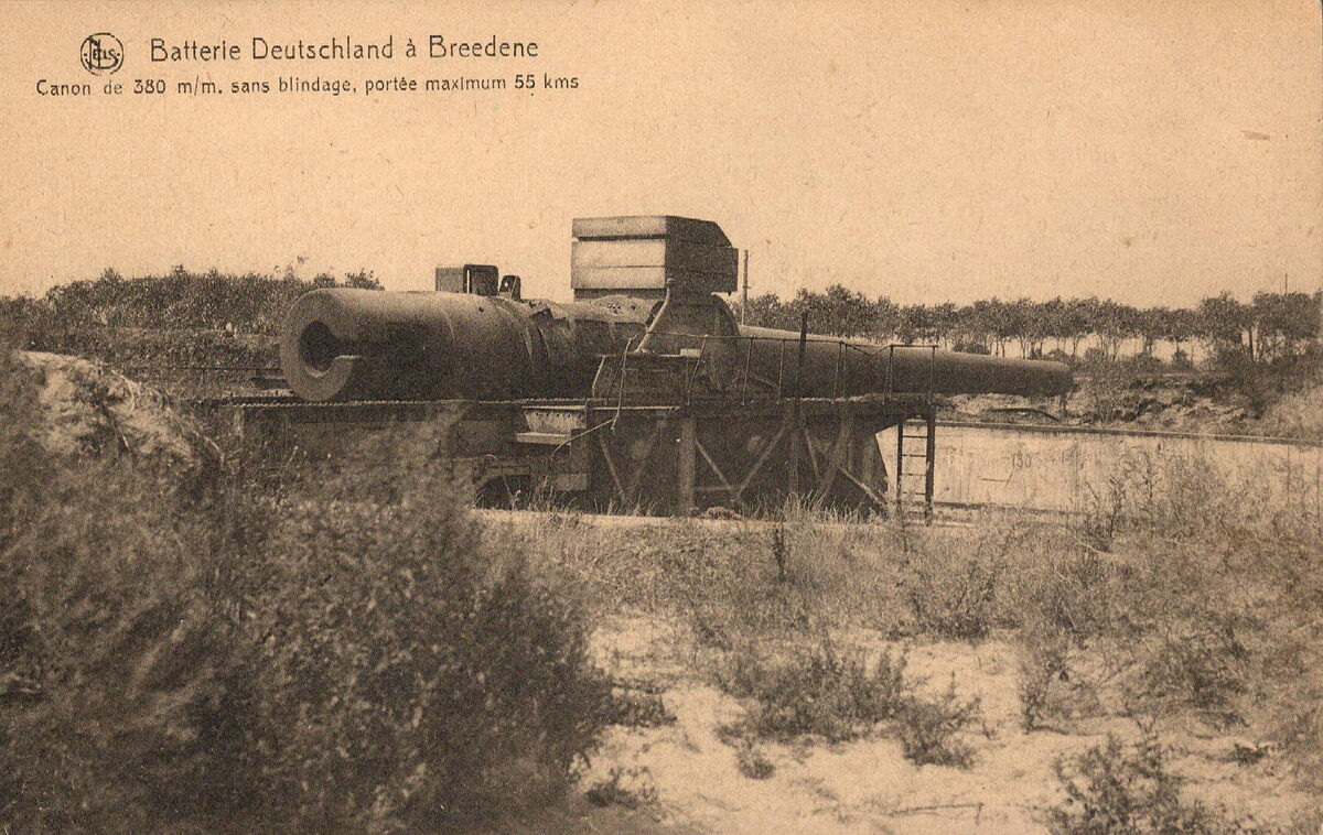 Nels. Ern. Thill, Bruxelles. - Service des Sites de la Guerre 1914-18. Vendu au profit des Oeuvres des Invalides et Orphelins de la Guerre. - Batterie Deutshland à Bredene. Canon de 380 m/m, sans blindage, portée maximum 55 km.