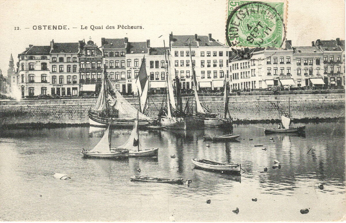 L. Lagaert, N°12. - Ostende - Le Quai des Pêcheurs. - Vissersvaartuigen gemeerd in het Schuildok. Vooraan, enkele Oostendse schovers. Op de achtergrond, de Visserskaai.