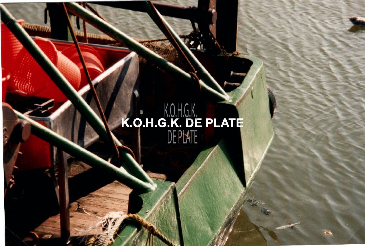 Formaat : 10 x 15 cm. - Stalen boomkorvisser O.100 "Emilie" met Baudoin motor voor reder Constant Wynsberghe met verschillende technologische middelen. Detail van het schip
