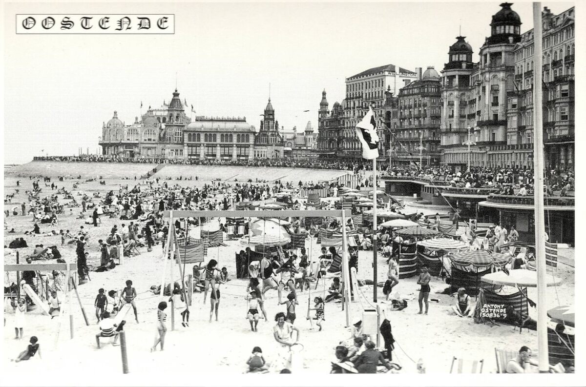 Tropic T 134. - Foto Antony 150836-9. - Strandrecreatie op het Groot Strand nabij de badinstallaties onder de Albert I-promenade. Vooraan, de vlag van de kinderclub "Papa Ours". Op de achtergond, de westelijke gevel van het derde Kursaal gelegen langs de Albert I-promenade.