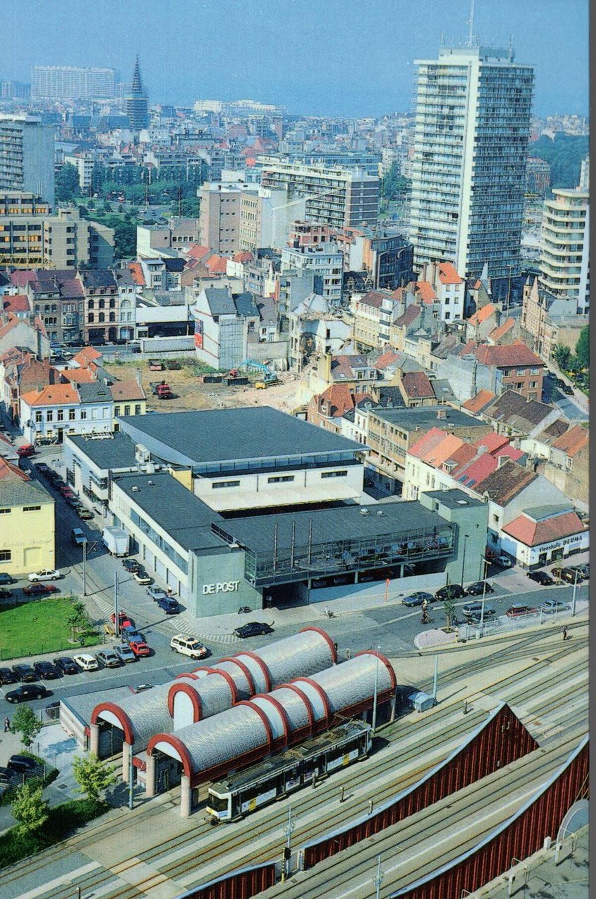 Tropic T 306. - Panorama van de wijk Hazegras. Vooraan, gebouw voor onderhoud van de trams van de Lijn. Het postgebouw en rechts, de woontoren "De Mast"