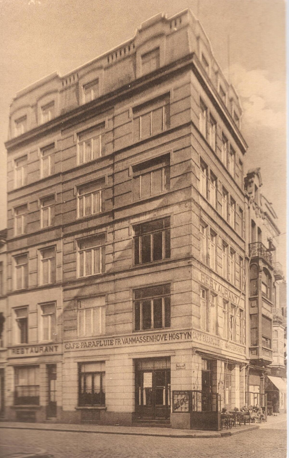 2717. A. Montmorency, 17, Bd M. Lemonnier, Bruxelles. - Prop. : Fr. Van Massenhove-Hostyn. Arrangement spécial pour sociétés. - Het hotel was gelegen op de hoek van de Groentemarkt en de Nieuwstraat