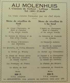 Advertentie : Au Molenhuis. Menu de réveillon de Noël. Menu de Réveillon de l'An Neuf. Torhoutsesteenweg 3, Leffinge