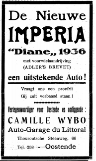 Advertentie : Auto-Garage du Littoral. De nieuwe Imperia "Diane" 1936. Torhoutsesteenweg 66, Oostende
