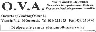 Advertentie : AVO. - Onderlinge Visafslag Oostende, Vismijn 71, 8400 Oostende, tel 059 / 32 21 73, fax 059 / 32 04 46. - De cöoperatieve van de reders, met 40 jaar ervaring. - Voor uw visveiling... te Oostende, Voor uw koeltransporten... naar Oo...