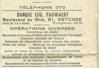 Advertentie : Banque Eug. Pauwaert. Boulevard du Midi 81 Ostende