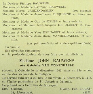 Advertentie : Doodsbericht Madame John Bauwens, née Gabrielle Van Wynendaele