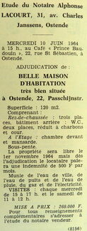 Advertentie : Etude du notaire A. Lacourt. Vente publique. Belle maison d'habitation. 22, Passchijnstraat, Ostende