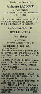 Advertentie : Etude du notaire A. Lacourt. Vente publique. Belle villa. Nieuwe Langestraat 49, Stene
