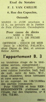 Advertentie : Etude du notaire F.J. Van Caillie. Vente publique. Appartement B3. Royal Palace. Digue de Mer, Ostende