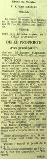 Advertentie : Etude du notaire F.J. Van Caillie. Vente publique. Belle propriété avec grand jardin. 51 Square Stéphanie, Ostende