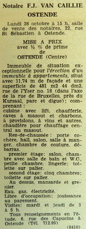 Advertentie : Etude du notaire F.J. Van Caillie. Vente publique. Immeuble. 18, rue de l'Yser, Ostende