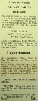 Advertentie : Etude du notaire F.J. Van Caillie. Vente publique. L'appartement du cinquième étage dans le bloc H. 30a rue de L'Yser, Ostende