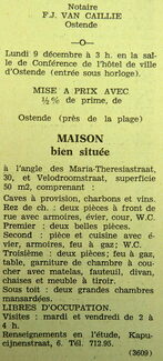 Advertentie : Etude du notaire F.J. Van Caillie. Vente publique. Maison bien située. L'angle des Maria-Theresiastraat, 30 et Velodroomstraat