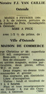 Advertentie : Etude du notaire F.J. Van Caillie. Vente publique. Maison de commerce. Rue Christine 99, Ostende