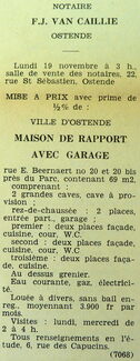 Advertentie : Etude du notaire F.J. Van Caillie. Vente publique. Maison de rapport avec garage. rue E. Beernaert 20, Ostende
