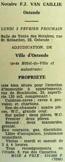 Advertentie : Etude du notaire F.J. Van Caillie. Vente publique. Propriété. Rue de Stockholm 33, Ostende