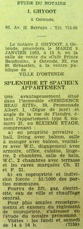 Advertentie : Etude du notaire J. Ghyoot. Vente publique. Splendide et spacieux appartement. "Résidence Beau Site". 39 Promenade Albert I, Ostende