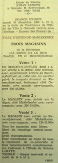 Advertentie : Etude du notaire J. Lahaye. Vente publique. Trois magasins en la Résidence "La Brise et le Rio". Zeedijk 170 et Raversijdestraat.