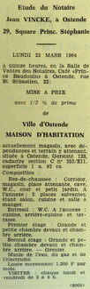 Advertentie : Etude du notaire Jean Vincke. Vente publique. Maison d'habitation. Gerststraat 128, Ostende