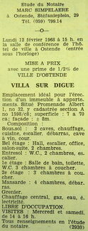 Advertentie : Etude du notaire Marc Simpelaere. Vente publique. Villa sur Digue. Promenade Albert I, 32