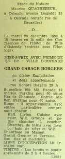Advertentie : Etude du notaire Maurice Quaghebeur. Vente publique. Grand Garage Borgers. Rue Honoré Borgers 29 A.