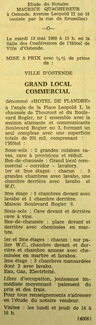 Advertentie : Etude du notaire Maurice Quaghebeur. Vente publique. Grand local commercial dénommé "Hotel de Flandre". A l'angle de la Place Leopold I, la chaussée de Thourout et du Boulevard Rogier 1.