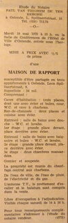 Advertentie : Etude du notaire Paul van Tieghem de ten Berghe. Vente publique. Maison de rapport. Léon Spilliaertstraat 9