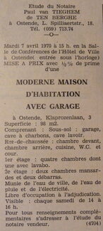 Advertentie : Etude du notaire Paul van Tieghem de ten Berghe. Vente publique. Moderne maison d'habitation avec garage. Klaprozenlaan 3, Ostende