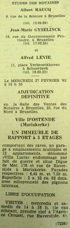 Advertentie : Etudes des notaires Albert Raucq, Jean-Marie Gyselinck et Alfred Levie. Vente publique. Un immeuble de rapport à 5 étages. Digue de Mer 176, Ostende