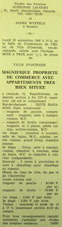 Advertentie : Etudes des notaires Alphonse Lacourt et André Wyffels. Vente publique. Magnifique propriété de commerce avec appartements. Kapellestraat 74
