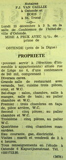 Advertentie : Etudes des notaires F.J. Van Caillie et Boes. Vente publique. Propriété. Rue de Liège 6