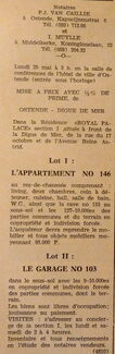 Advertentie : Etudes des notaires F.J. Van Caillie et I. Muylle. Vente publique. Lot I : L'appartement no 146. Lot II : Le garage no 103. Résidence "Royal Palace". Digue de Mer, Ostende
