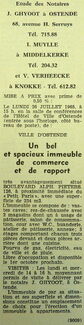 Advertentie : Etudes des notaires J. Ghyoot, I. Muylle et V. Verheecke. Vente publique. Un bel et spacieux immeuble de commerce et de rapport. Boulevard Alph. Pieters 126, Ostende